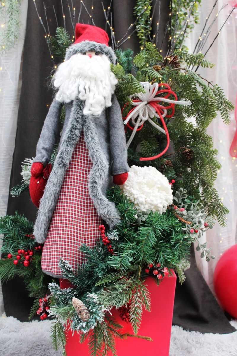 Montage avec branches artificielles, décorations artificielles et un Père-Noël.