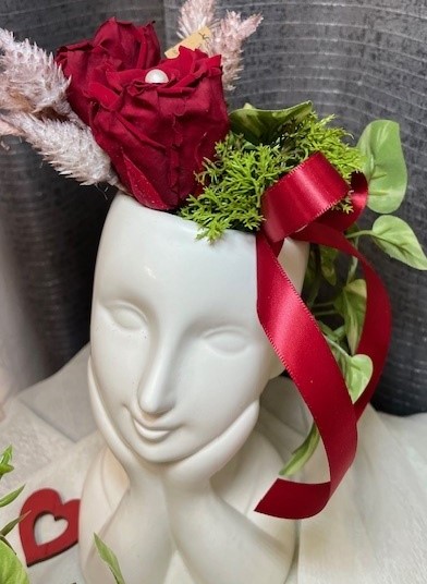 Montage de roses éternelles accompagnées de feuillage artificiel